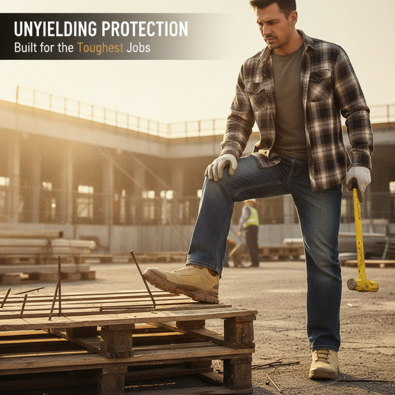 PUNCTURE-RESISTANT SOLE - Featuring an integrated anti-puncture plate, the sole effectively prevents sharp objects like nails or metal shards from penetrating the shoe, safeguarding your feet from painful injuries and offering peace of mind throughout your workday on various terrains.
