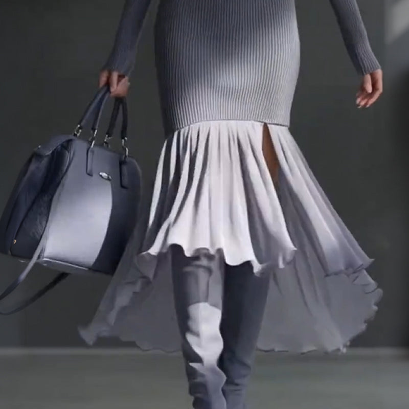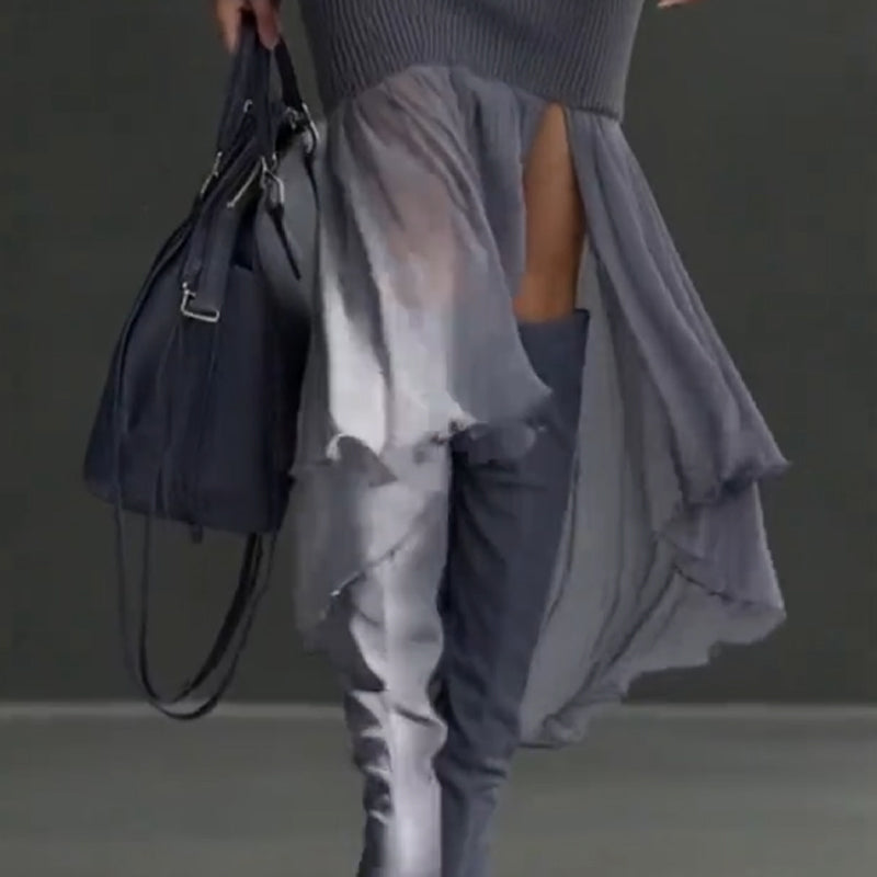 UNIQUE PATCHWORK HEMÂ - A striking contrast of textures, the flowing lower panel adds a dynamic and romantic flair. This unique design creates beautiful movement as you walk, ensuring you make a memorable and stylish entrance.
